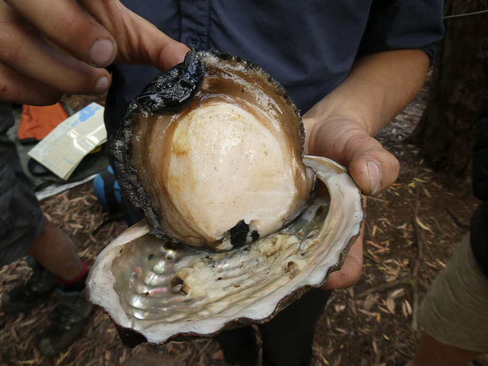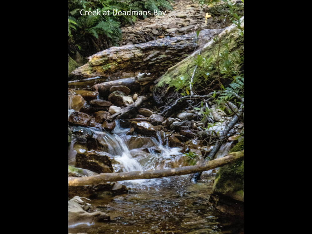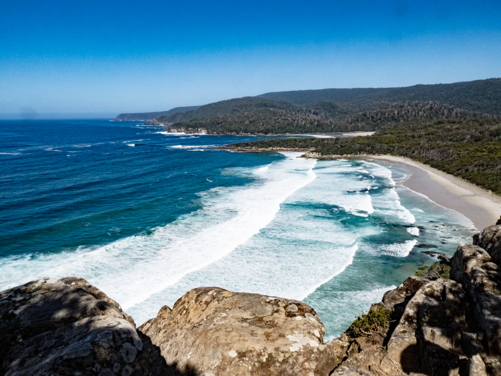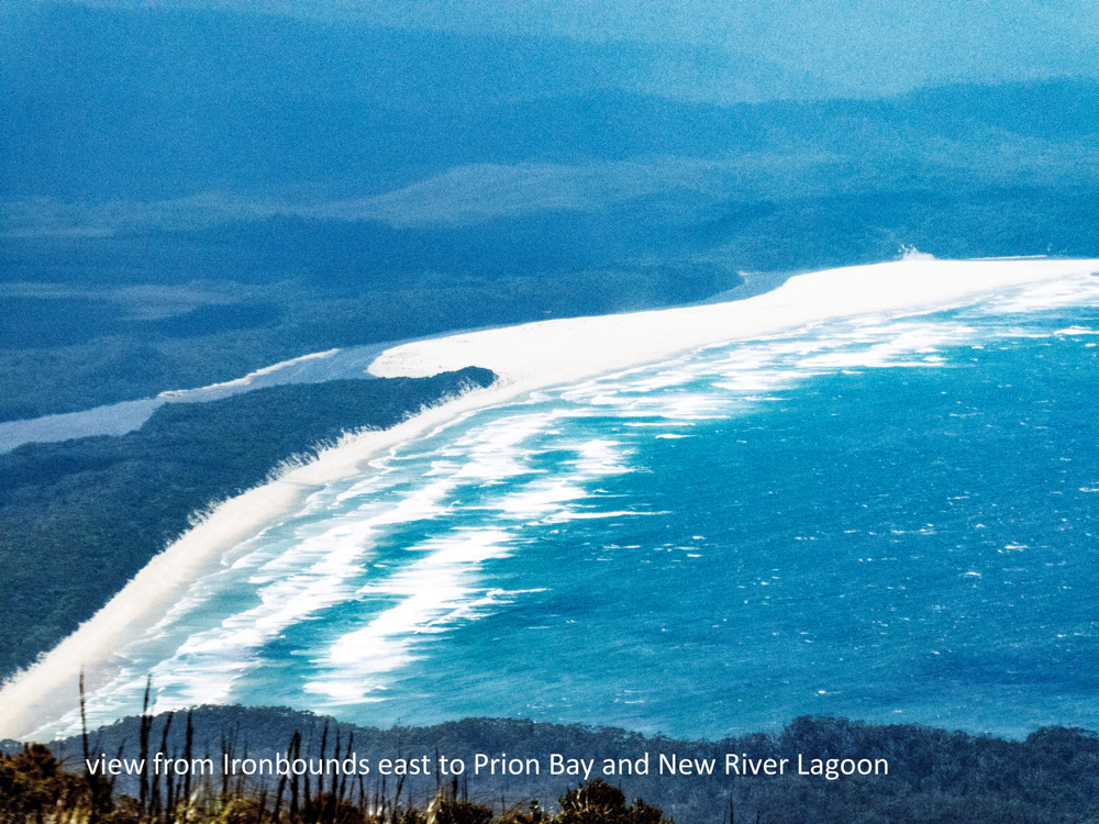 Though it is “only” thirteen kilometres from Little Deadman’s bay to the campsite at Surprise Bay, it took me 13 hours including breaks; leaving at 8am and arriving at 7pm. The walk begins with a short stroll along the rocky Little Dead man’s Bay, past the little creek that provides such delicious fresh water, until reaching an orange marker on a tree. Here is where the track continues. The track is rough (but easy to follow) requiring sustained concentration on foot placement and balance. An injury anywhere on this walk would be very difficult to manage. On a map the small black dots that signify the walk route break few contour lines, but inside that contour interval of 40 metres, it undulates and twists remorselessly. We briefly walk along Deadman Bay before leaving the coast once more to walk through forest and climb over Menzies Bluff. Many matures trees provide shade for this section of the walk. About three hours after leaving Little Deadman’s Bay we reach the stately Prion beach. The walk along Prion beach goes for four kilometres and provides wonderful views of the surrounding mountains, and adjacent ocean. We continued along its length until meeting a sandbar. Here we turned north to find the boats and other walkers all making ready to cross. The boats are well secured against rising tides and weather and we needed to unclip and haul them down to the wide lagoons water line. This beautiful body of water, the end of the biggest river of this coast is named New River lagoon. The water is a deep blue, a breeze ruffling its surface; there is a band of trees and scrub and standing far behind and high above them, I can see Precipitous Bluff. This is an impressive near vertical monolith stained an even blue by haze and distance. To cross, packs are stowed in the rowboats and oars placed in rowlocks; it only takes 10 minutes to row across. It is essential to leave a boat on each side and both will need to be secured as we leave. The attachment points are sturdy steel carabineers attached in turn to heavy rope. We had lunch sitting on the ground in the forest lying just beyond the lagoon. The weather was beautiful, sunshine and clear skies, it all made for amazing vistas. I could only imagine how difficult it would be to cross the lagoon in rough seas and heavy rain.