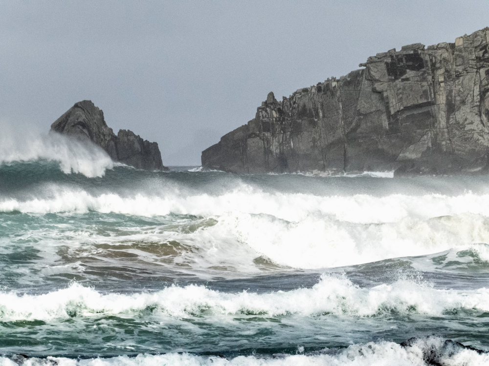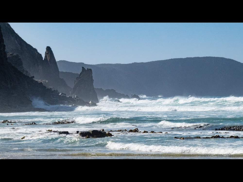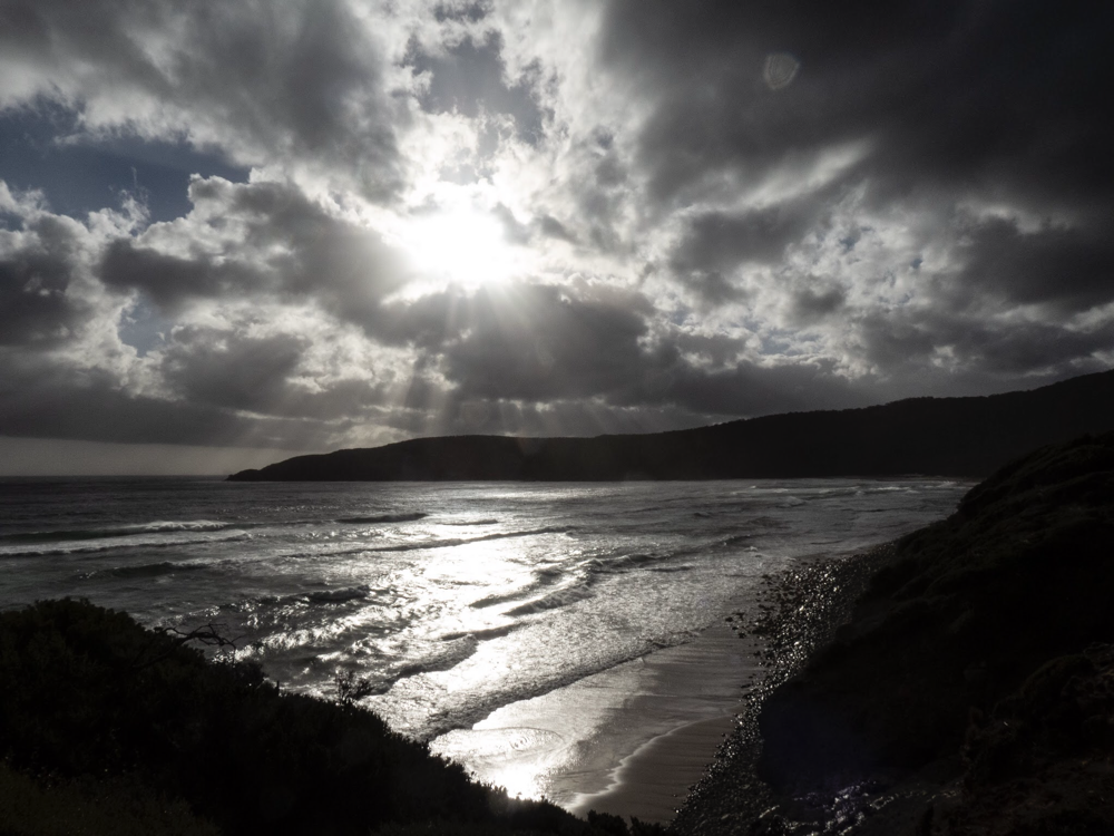 I visited the beach again. To the south the sky was filled with abundant grey cloud, turning the water and surf a steely-grey. Then the sun pierced through a small gap in the clouds, sending scintillating beams of light through the air to dance on the crests.