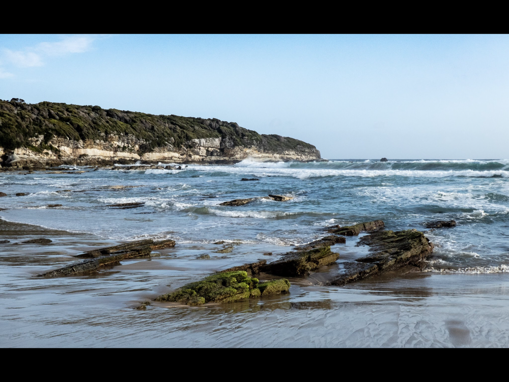 This morning I woke up, grabbed my trusty camera, a Panasonic TZ-90, and revisited the beach for some early morning photography. It impossible for me to do justice in words or even pictures to the serenity and still beauty of this place. Far in the distance, across an expanse of ocean, is South East Cape a narrow promontory, a featureless blue due to sea and wind haze. Turning my eyes to the left, I can see a nearer promontory, its distinct layers of stone and rock merging with the east end of the beach. Surf crashes over the rocky platforms that emerge from the sand covering them in white flecks of tumbling water. The beach sweeps around the bay, white and unobstructed, with hooded plovers quickly marching on the shore, sea gulls and pied oyster-catchers wheel over the waves before landing on the beach and peck at the sand beneath their feet. Grasses clump in small protective mats in the sand higher up the beach. Behind them tea trees and taller grasses form a forest well above the water-line. The surf roars non-stop: long unbroken wave crests cross the width of the bay, before crashing into rocky points or surging up the beach where I am standing. Waves surge into the mouth of the rivulet, sending ripples across the brown water of the lagoon before dissipating upstream, wobbling the tree reflections as they pass.