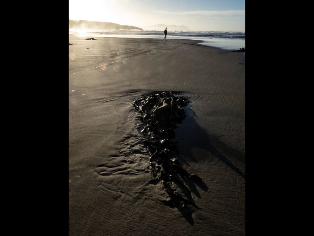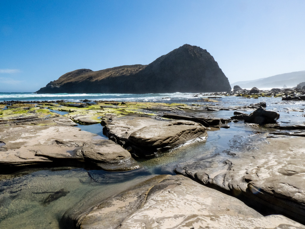 I wandered down to the beach to fill up my bottles once more and then walked to explore the rocks and rock pools beneath the Lionhead, the huge stone island abutting the coast. To me it resembles a lion couchant, with its hind quarters facing the incoming seas. Between the island and the beach are vast rock pools and stone formations, while giant untethered kelp now wafts in the water beneath its surface.