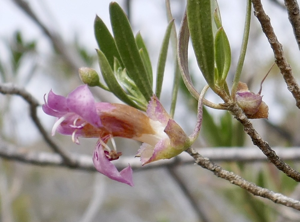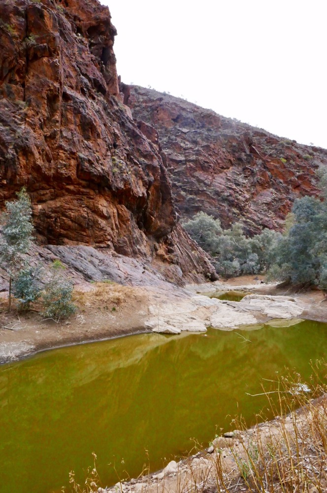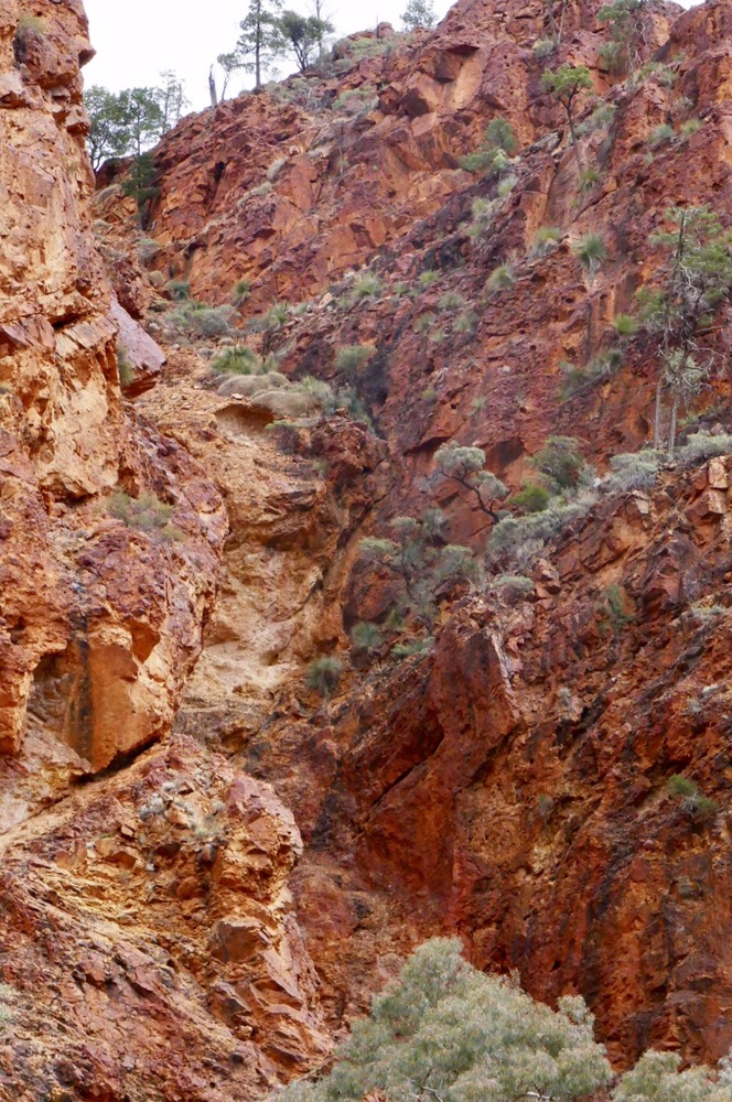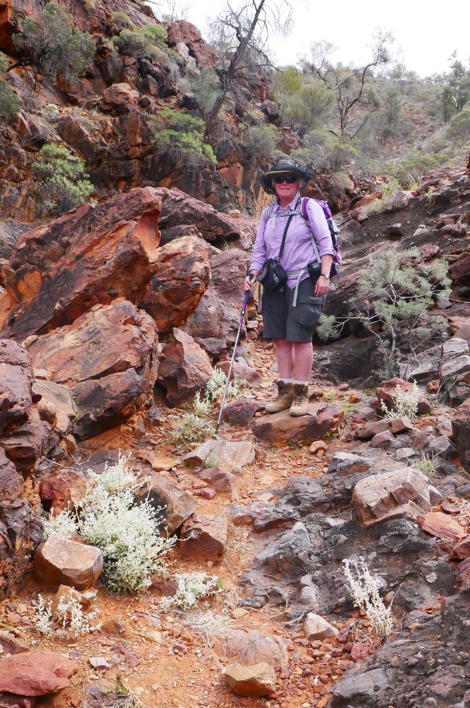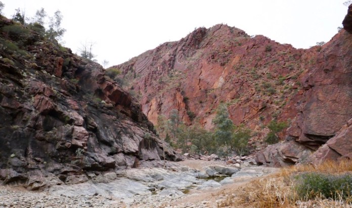 It’s Saturday and it’s our last day before departing in earnest to catch the boat. It is still overcast which might put a mozzie on tonight’s astronomy experience. Mm. Any way we gave had a terrific day, doing the final short walk in Arkaroola. It’s called the Bararranna Walk and it’s Highlights are the tellurite lined creek from Tellurite Gorge, and the Bararranna Gorge and Stubbs Waterhole. The track is a circuit beginning from Welcome mine trail head. This was the site of a copper mine so there is lots of malachite and ansurite fragments on the ground. The mines are vertical drops mostly with just a few bits of timber marking them. However unless you were silly enough to go near them, they don’t pose a risk to adults. The track winds westward, its narrow and rocky and eventually comes to a slate and shale field. There are Emu bushes here, it’s a pretty red fuschia flower. It’s on the blog prior to this one.
