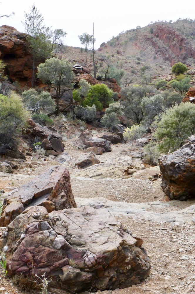 The track follows the creek to its junction with Arkaroola creek. Here we found Stubbs Waterhole, and it’s very still, very beautiful. Sheer quartzite walls with a green Rockpool. The rivergums all standing mute as sentinels near the banks. There was a small yellow bird drinking water and then flew up to sit in a tree near the Waterhole. Arkaroola creek is also fine walking. The track now requires small and large boulder hopping rather than scrambling. The stones are of so many colours reflecting their many origins. We diverted to visit Bararranna Gorge. There’s a massive ripple rock platform tipped into the vertical. There are masses of blue flowers. There is some water in the rock pool. It is a very peaceful sight. We carried on along the creek and ultimately back to the car. We passed some interesting geology. There was a huge rock that had been scratched by stones moved by a glacier. There was the formation called Humanity seat which is vertical sedimentary rock consisting of quartzite and shale. There is a spot early on in the walk where you see two small hills, these contain evidence of early bacteria that once created the huge coral reef I mentioned earlier.