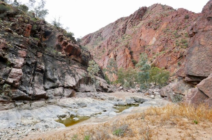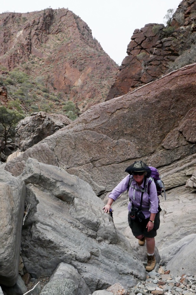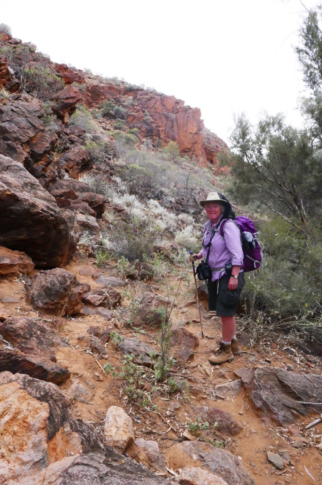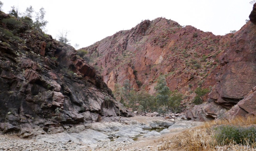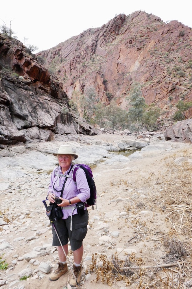 Here we are in Arkaroola. Arkaroola is private wilderness sanctuary to the north and immediately abutting the Gammon ranges national park. It’s dry and hot in Summer but this time of the year, well, it’s still dry but it’s not hot. Overnight, it’s cold and over the day it gets to the high twenties. It’s perfect walking weather. Sunny, warm enough and usually a breeze to keep the flies from finding us.
