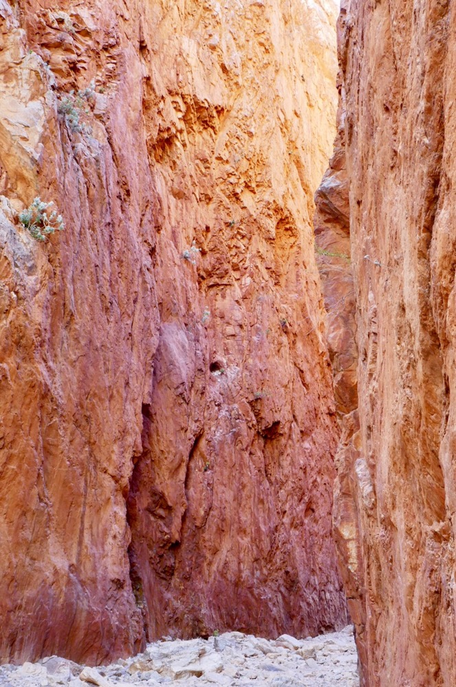 The next morning we finished section one by walking to Simpson Gap. This hike followed the hills beneath cliffs and ultimately provided fine views of the gap. It was cloudy and cold but rays of sunlight struggled through illuminating the valley. Simpsons Gap is wide, beautiful and sacred. The inviting pool is not for swimming. River gums twisted by the rigours of summer floods sit in the sand and stones of the ancient waterway, a creek course that long precedes the range it breeches. Ghost gums with their bright green foliage and shimmering white bark grip the sandstone walls. After exploring the gap we bussed to Standley Chasm. This geological feature is named for Ida Standley, an early twentieth century educator who actually taught aboriginal kids. We waited for our guide, Dee, but she had been double booked so had to catch up with her after lunch. Ryan, one of our four guides took us into the chasm. It is a gorge with sheer walls of orange quartzite. The narrow passageway echoes any conversation. The air is still and cool. It is impossible not to feel a sense of awe. This chasm was made by the erosion of a layer of white dolerite, leaving the quartzite for us to see today. Or was it two euro brothers who had an argument and one split the hill apart with the downward lash of his tail? I guess we will never know for sure. On the walk, Ryan showed us spearwood. Spearwood looks like a group of thin canes but if you hold one over a fire and stretch it straight, you can create a very good spear. It’s light, and made deadly by tying on a shard of quartzite or the poisonous wood of the mulga. It’s thrown from the rear of the spear and with little practice, can prove very accurate.