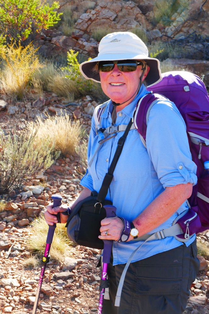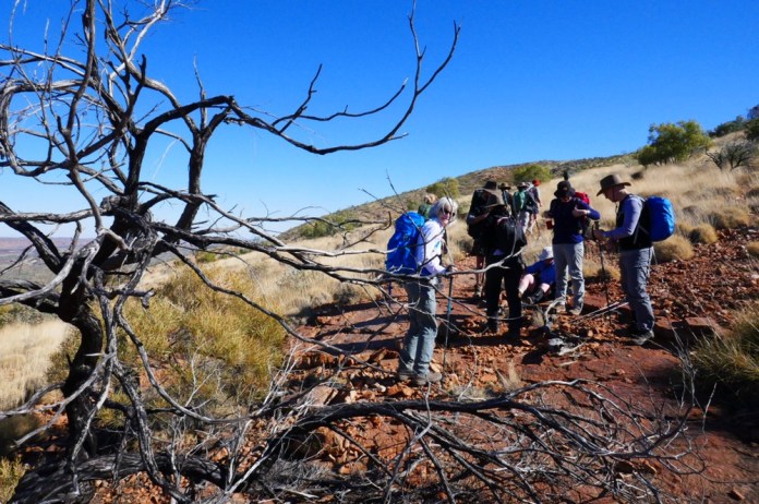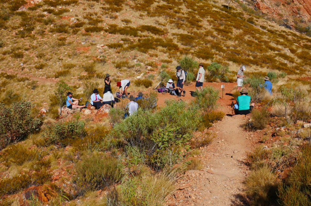 On Wednesday morning we were collected at our overnight accommodation, Doubletree in Alice Springs bright and early at 7:30 am. There are sixteen walkers, and all of us have elected for the highlights version of the famous Larapinta trail. The full walk takes anything from twelve to sixteen days, and walkers have to be very well organised with food drops and equipment. We met two walkers, young men who had been walking for eight days or seven, they weren’t sure. Our little packs looked very diminutive beside their solar panel laden multi day packs, the road trains of the Larapinta trail.
