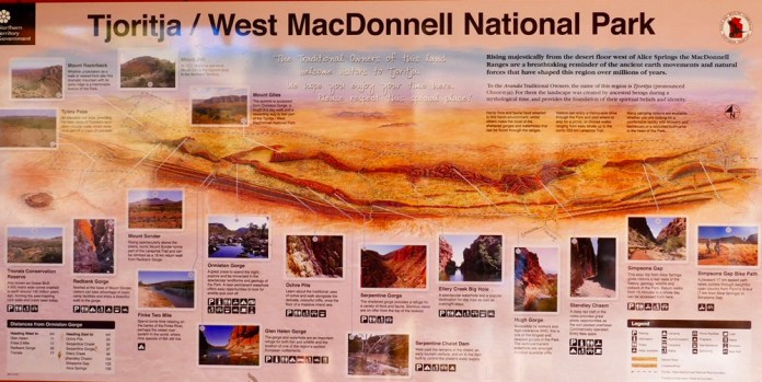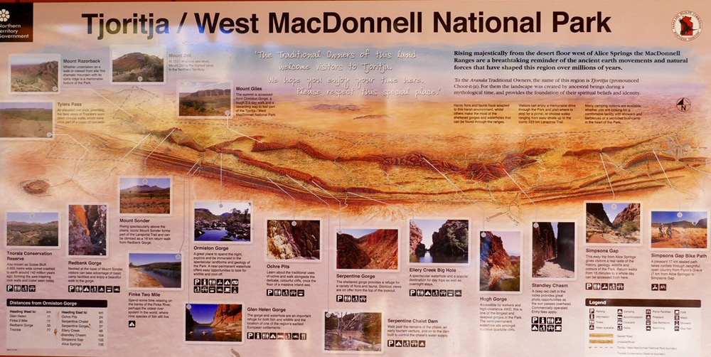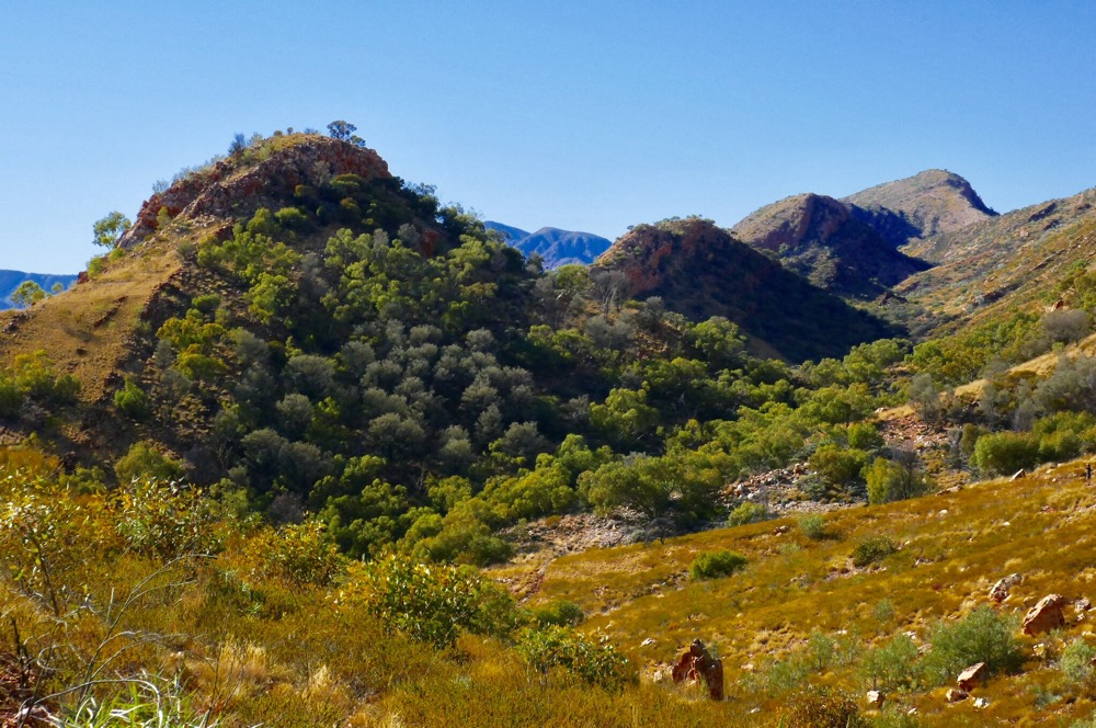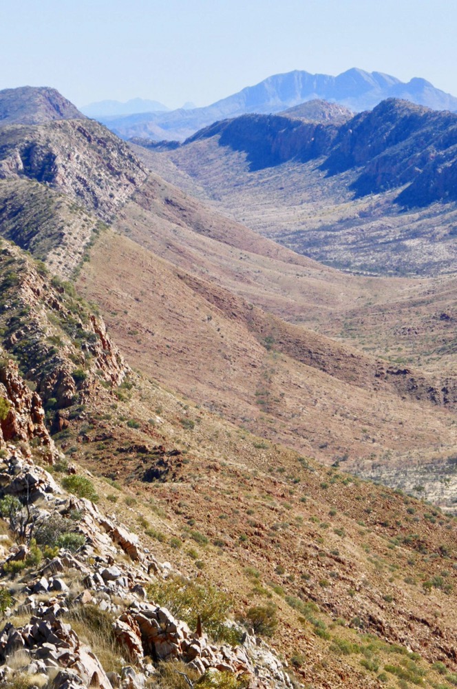 We returned to collect our packs, then shed some thermal gear with the increasing warmth of the day, then carried on, meeting the Arrente track. This track connects the Inarlunga Pass (Echidna Pass) with the Ochre pits. It is only a nine kilometre walk but it’s not easy, the rolling rocks which make the track, discourage mindless walking. I needed to stop before taking photographs, repack the camera, survey where to put my next step before carrying on. The track provides wonderful views of the ranges on either side of the track. It weaves over and between the crests of a series of hills. There are occasional information stands. These describe the plants and how they were used in Arrente life.