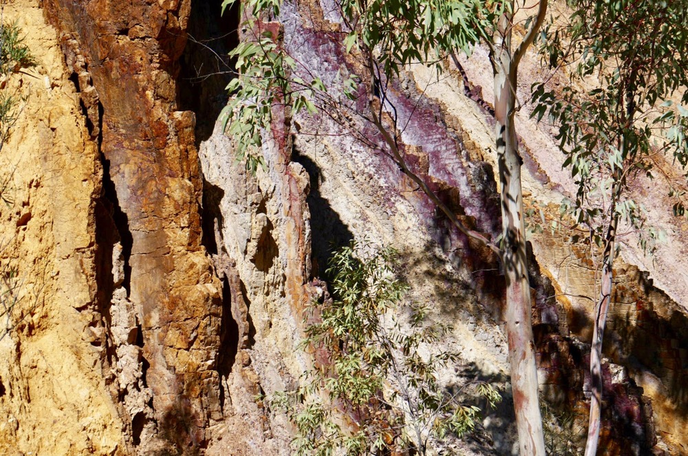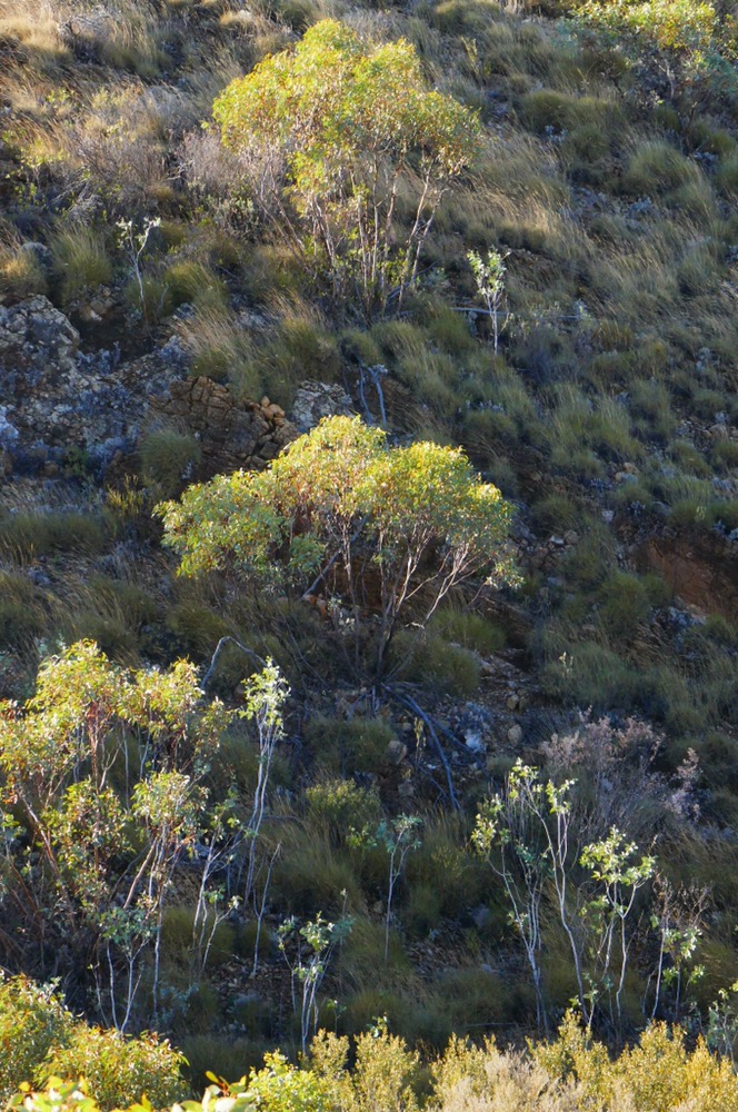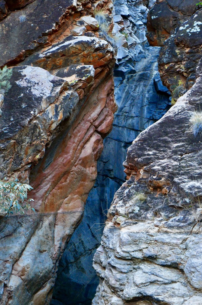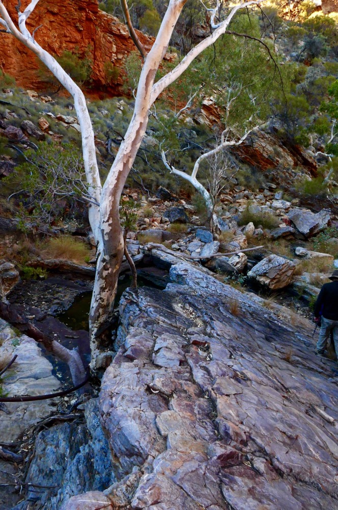 Our walk this morning, commenced in the most magical of early morning light. You know on some special mornings, the crispness and toning of the light give a beautiful glow to the natural world. One of the guides said to look out for some unique natural rock formations on the walk. Some of us were a bit non plussed about where the artificial geological formations were. While our bags were being carried to our next campsite, we walked to serpentine chalets dam. This dam was built below a narrow Gorge and provided water for the shirt lived Serpentine Chalet. Only the ruins remain, it was constructed in the 1950s before the road was improved and the speed of travel meant stopping for a night was unnecessary. The walk to the dam involves some rock clambering. The Gorge here is very beautiful. Our guide took us on a vertical side trip, to see these formations. The layers of rock are curved, in near swirls of sandstone over a hundred meters. The forces would have been truly immense to create this amazing appearance. We walked to Inarlunga pass. The trees here can be heard, pressing my ears against the white trunk of a ghost gum, I can hear the glug glug of water moving upwards from the roots on the way to the leaves above.