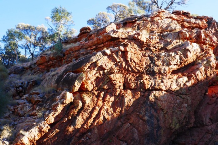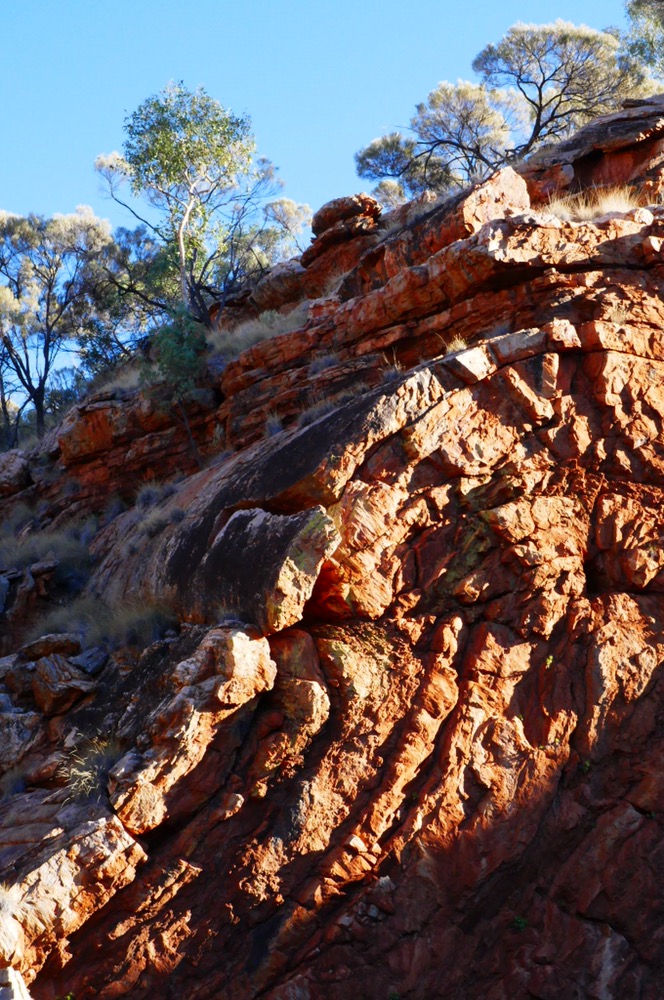 We arrived at the parking area situated at Palm Creek.. There are four walks we could choose from. We opted for a five kilometre walk that went up onto the escarpment, along the cliff with views into Palm Creek , then turning southwards across the plateau, then dropping down along a narrow rocky track back down to the creek bed. We followed this circuit track with Mark, chatting as we do about all sorts of things. By now it was warmer so we had tucked away our jumpers as we walked along. It is a very beautiful walk but with slight squinting and a liberal dose of imagination, you can almost hear the dinosaurs that walked this same area, between the same species of palms and cycads we are seeing right now. The creek bed is rocky not sandy or of loose stone, it’s granite and then sandstone, the fine beds are twisted or more accurately tortured into swirls and folds by the geological forces that have made this place. Yet despite all this geological tom foolery, the Finke River and Palm Creek have had unaltered courses for 190 million years, simply eroding the rocks and even mountains that had the cheek to appear.