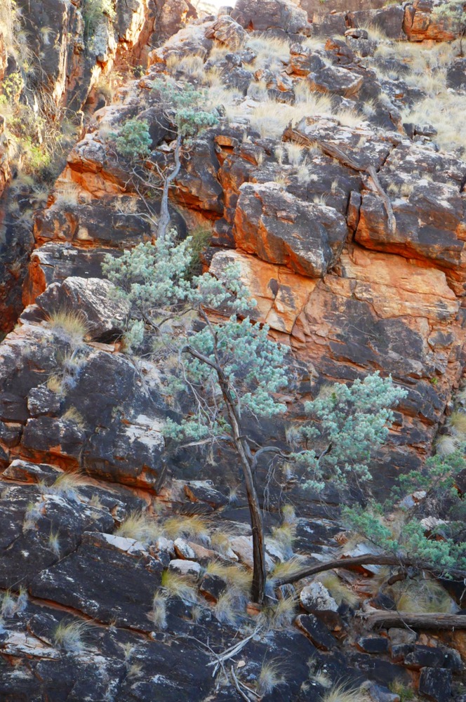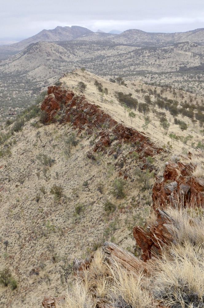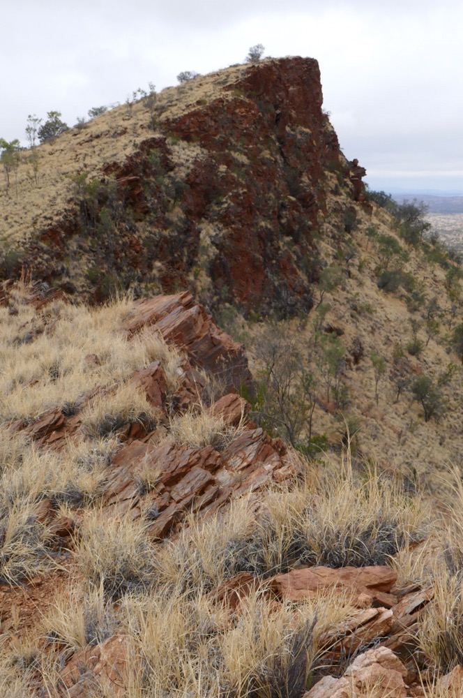 We grouped at Telegraph station on the outskirts of Alice Springs, made introductions. The walkers are from age fifty to sixty and all of them have done many interesting adventures both here and overseas. We were dressed in warm gear because of the cold. Little did we know, that it was going to get a lot colder. We skirted the old station, and commenced the first section of the trail. Cloudy, cool, mild fresh breeze and perfect weather for walking. A frizzle threatened, and over the day it grew into a drizzle, and finally rain overnight. Today, we aimed to complete the walk to Wallaby Gap. We travelled past Charles River, under the Stuart highway, then up along ridges of the ranges. The fall to the left is precipitate, a three hundred meter drop, with wonderful views of the Pattuca range to the south beyond the spinifex and mulga plains. There are many opportunities to see the orange cliffs.