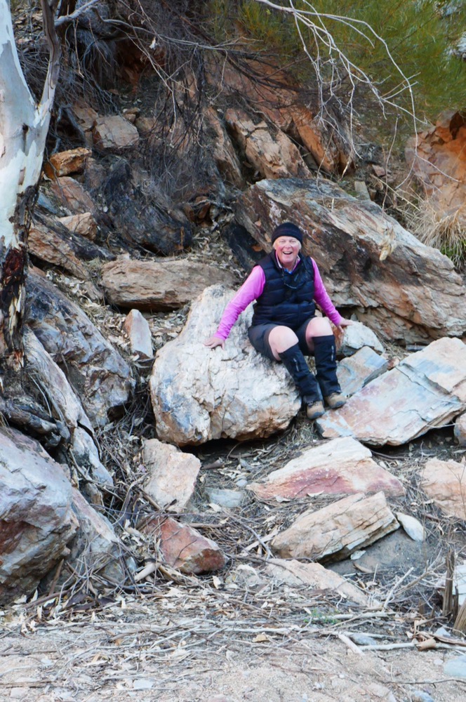 Lunches are under trees on the trail, a large black tarp is laid out, and a selection of ham, salami, salads, dips and garnishes are available for us. One does eat well on these walks. You need the energy, as the track undulates over ankle twisting rocks and gravel. I needed to stay alert despite my Scarpa boots and sticks, occasionally slipping but no harm done. I’d been bitten by a camp dog two weeks ago, and thankfully it’s well on the way to being healed, so it did not give me any problems on the walk.