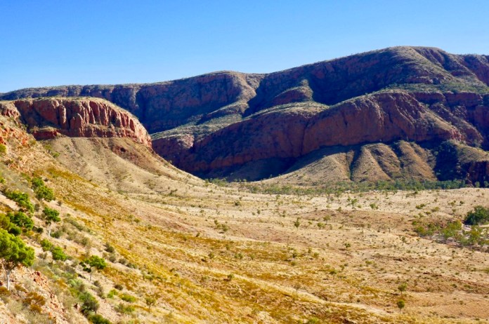 This morning, Jennifer and Dave did a car shuffle, leaving his car near to John Hayes Rock Pools. The track was rough requiring a high clearance 4WD. As he drove back with Jennifer, Di and I set out on the Ridge Top walk. This begins with all the other walks at the start of Trephina Gorge, but then heads off, on and up along the ridge that leads to Turners lookout. The track is rated as difficult but the cool wind and early 8am start made the trip easier. The track is rough, but safe to follow with many signs a long the way. There are stupendous views of the East MacDonnells and Trephina Bluff in particular. We could see for many miles, across the repeating ranges. There must have been a considerable fire as there was a lot of damage to trees and spinifex plants. However, soon we walked steadily up. Turners look out is on the edge of a vertical bluff. We had morning tea here, enjoying the very elevated views of the hills and ranges to the west. The track de steeply just after we rejoined the main track, bringing us to another Gorge, called the Chain Of Pools. We opted for the easier descent here, and we were all very glad we did as the views of the gorge were excellent. It forms a huge horse shoe bend in the mountain. I’ve never seen anything as striking as this before in Australia. We had lunch in the gorge. The rock pool was not all that inviting, but it was cool and shady beside the rocks. Dave, Di and I walked a short distance on the road to find the parked car. We drove back the eight kilometres to the camp site to meet Jennifer at the tent.