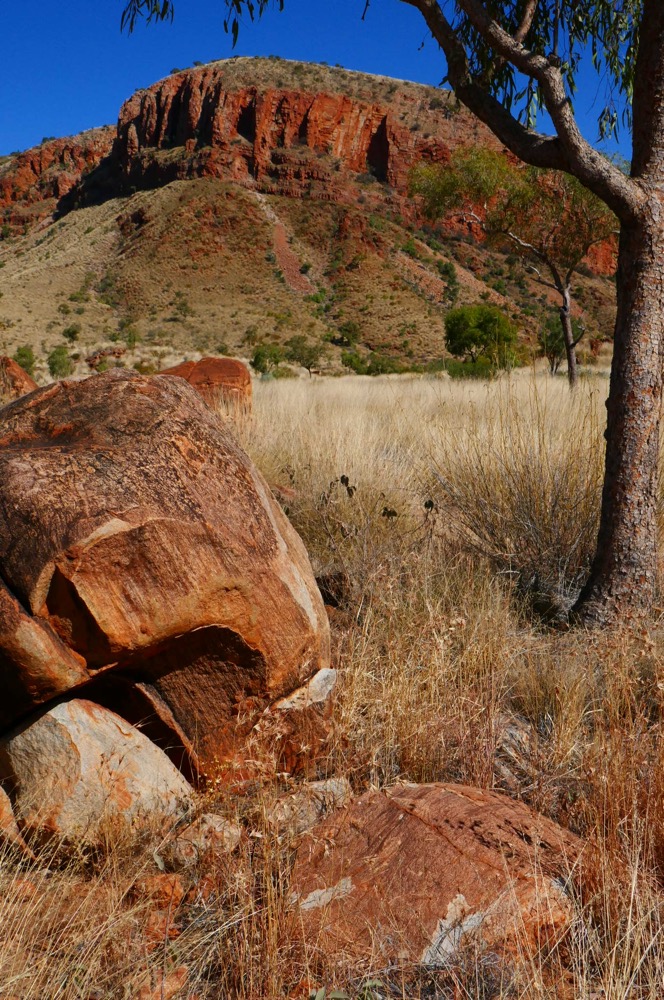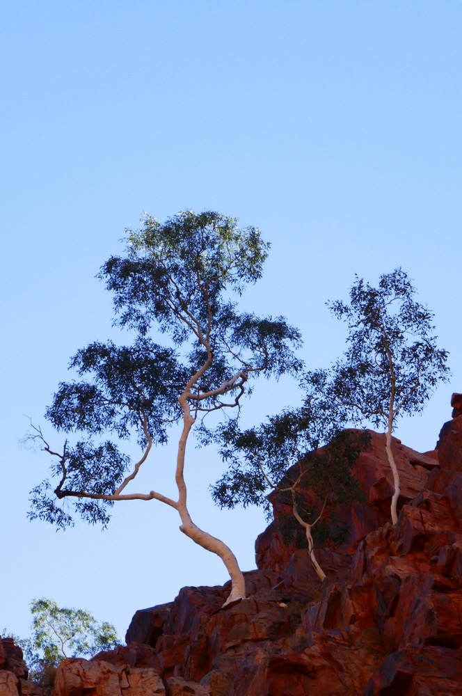 It is now five pm and I’m sitting under the big tent at Camp Fearless. Jennifer and I have had a quiet day, relaxing, talking. When the rest of the group returned from the 16 kilometre hike up and down Mt Sonder, they looked a bit battered and worn out by the adventure but were equally full of praise for the beauty of the mountain and the splendid views it delivered. Maybe next time for us, I need to be a lot fitter to have the strength you need to cope with the relentless climb and then descent. Jennifer and most of the group took the bus to revisit Glen Helen while I stayed here in camp to practice. I also went for a brief walk with two of my fellow travellers along the dry creek beside the campsite. No two river gums are the same are they? There are some great views of Mt Sonder to be had as well, its massif silhouetted by the giant gums and cork trees on and near the bank.