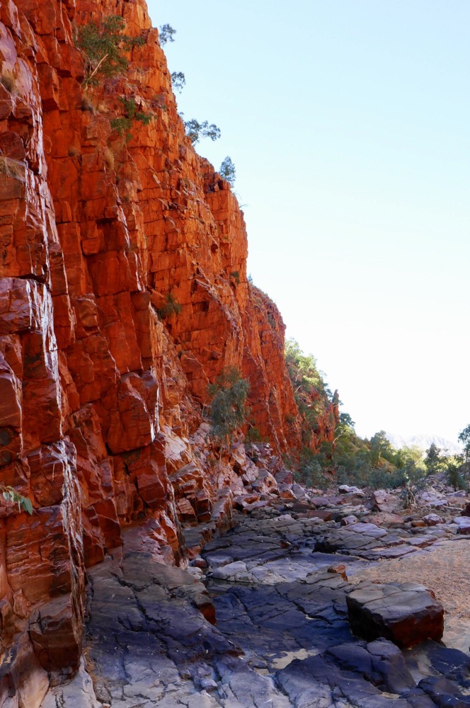 Jennifer and I are sitting in shade at the Joker Gorge car park. Dave and Di gave gone off track and are exploring the mine here. Breakfast was great, poached eggs, yummy muesli, a generous serve of yoghurt. Sophie made coffees for all of us. The restaurant is the old workshop, but in one corner, Nathan who is Sophie’s Dad, makes leather goods including traditional bull whips and belts. Hale River Homestead is a great place to stay. We four shared the cottage. There are three spacious bed rooms, numerous sitting areas, no wi fi, and so it’s easy to relax. The building has been well restored, but still retains a strong flavour of the 1940s and 1950s. The black round power switches, the paintings and pictures on the walls, the decor all harkens back to a less sophisticated but less demanding time in our history. The dining area is open, but it wasn’t cold or windy, there are books and newspapers to read while sitting in comfy old leather armchairs. The dinner was excellent, a scrumptious spaghetti Bolognese, with salad, and a stir fry as well. Desert was a piece of six year old Davids birthday cake. He’d spent the day creating this layered work or art. We chatted amongst ourselves, with Sophie, with Lyn and with some other guests who told us about their experiences in northern NT, and also about their adventures travelling the Canning stock route in 1995. A very convivial evening, indeed…………………………………………