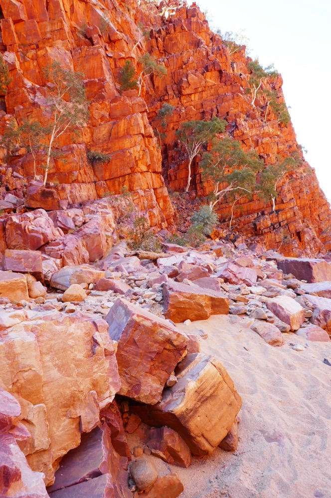 Mark of Sandrifter Safaris collected us at 6:45 this morning from outside our townhouse. The new moon was low in the pre dawn sky. It was chilly as we waited just off the road. Our first stop was on Larapinta drive, just as the sun rose over the gap, and the range before us immediately lit up into brilliant orange. While watching, we all enjoyed munching a fried egg and bacon rolls with some Australia Afternoon tea steaming away in our metal mugs. Yummy. Then we were on our way to Palm Valley. It’s about 120km from Alice and most of the trip is on bitumen but the last bit is a challenging 4WD including climbing over boulders, sand and river beds. There is precious little water around now but the Finke River is still very impressive. Firstly it’s wide, wider than the Sandover. Mmmm perhaps that doesn’t help. At least a 100 meters wide with immense red river gums scattered in the river bed. We cross confidently if not easily tailing briefly in sand before climbing up and out. The Land driver is a terrific car, comfortable, good take off angles, and air suspension which produces a prolonged fart when the car is stopped after a bumpy section.